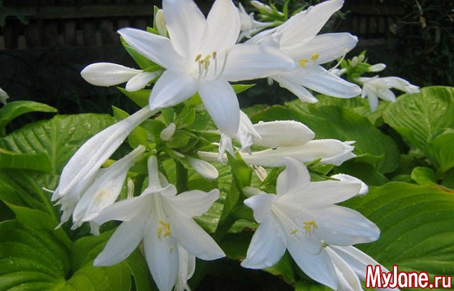 К «ночным цветам» по праву относятся и некоторые сорта хосты подорожниковой (Hоsta plantaginea), белые цветы которых на длинных изящных цветоносах распускаются в сумерках.