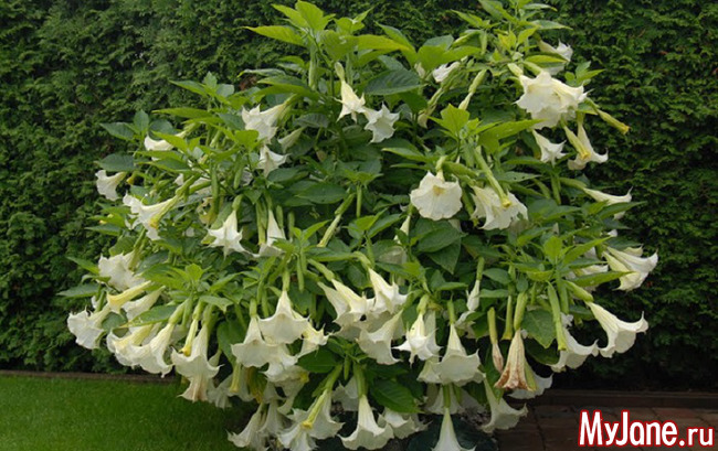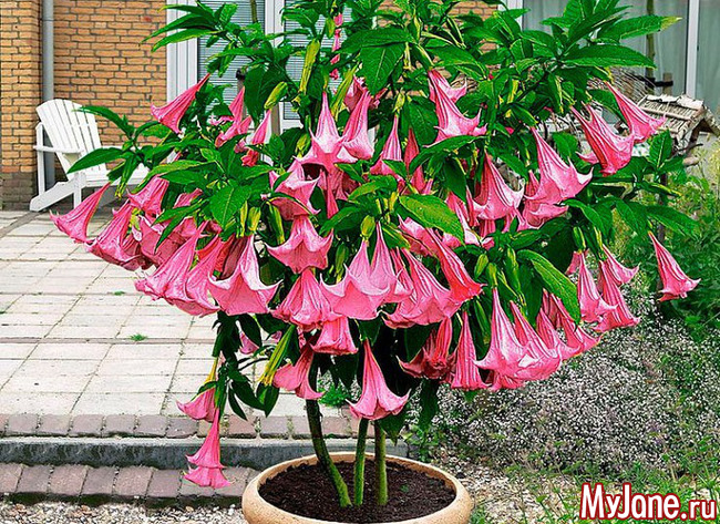 Бругмансия – растение семейства Пасленовых (Solanaceae), близкая родственница дурмана обыкновенного. Эта гостья из тропиков не перенесет нашу зиму в открытом грунте, поэтому зимует она в состоянии покоя, в прохладных светлых помещениях, зато летом, вместе с кадкой, запросто может перекочевать в цветник под открытым небом.