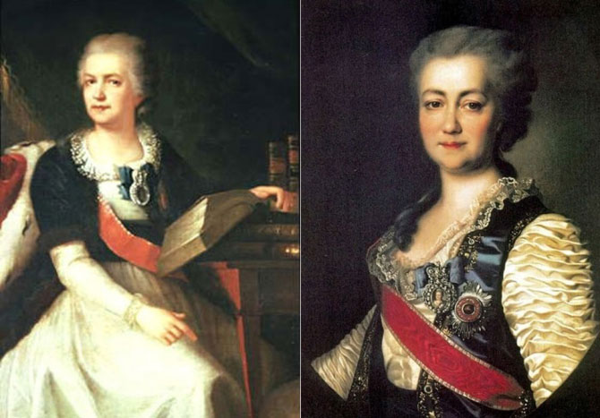 Слева – парадный портрет княгини Е. Дашковой. Неизвестный художник. Справа – Д. Левицкий. Портрет Екатерины Дашковой, ок. 1784