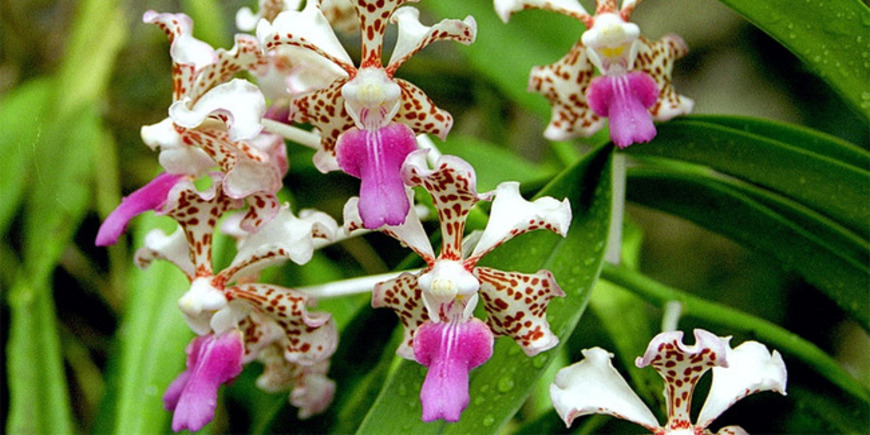 - ванда трехцветная отличается как окраской (леопардовый узор на кремовых лепестках), так и формой лепестков – она немного звездчатая. Цветы немного мельче, чем у голубой ванды, но от этого не менее выразительные.
