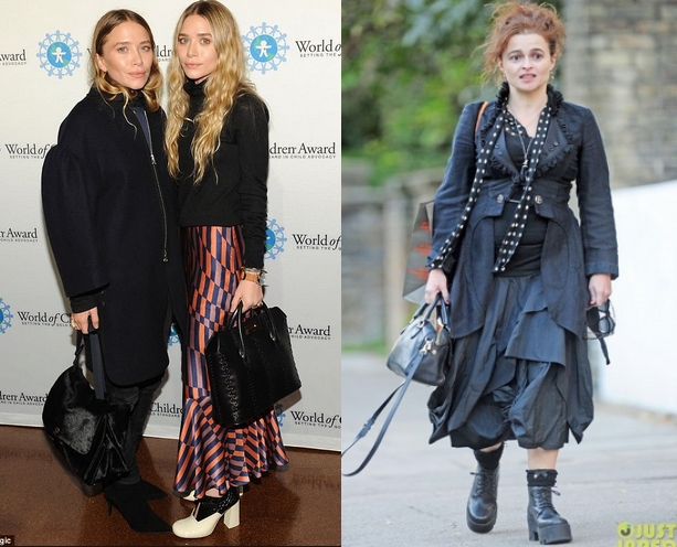 Второе направление — это «небрежность». Оно становится все более популярным, потому что в повседневной жизни его проще использовать. Чем характеризуется это направление в первую очередь: можно так, а можно и этак. Хочешь, шарф закинь на плечо, а хочешь — обмотай вокруг головы. Не застегивай пальто или куртку. Сочетай то, что всегда считалось несочетаемым. Четкости нет ни в чем, даже если ты используешь сумку жесткой формы или архитектурно скроенный жакет — четкости нет, потому что все равно весь образ выстраивается свободно и нечетко. Ролевых моделей тут конкретно нет, я бы сказала, что это весь современный стритстайл. И часто подиумы тоже все больше пропагандируют небрежность. Но где-то в максимальной точке этого направления существуют сестры Олсен и бохо стиль с его богиней Хеленой Бонем-Картер.