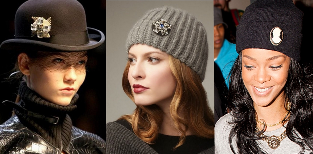 Совсем иначе выглядит сознательная ирония над «тщательной» деталью в «небрежном» образе. Вот например, брошь на шляпе — понятно, что тут все безупречно и это стопроцентная «тщательность». (кстати, подумала, что «тщательность» еще можно охарактеризовать словом «дендизм»). Второе фото — это попытка вытянуть в «тщательность» обычную вязаную шапку. А третье фото — сознательная ирония и добавление «тщательной» детали в «небрежный» образ: темнокожая девушка нацепила классическую камею на шапку-бини (которую она явно не для тепла надела), и сочетает это с большим количеством золотых украшений, надетых поверх простой серой футболки.