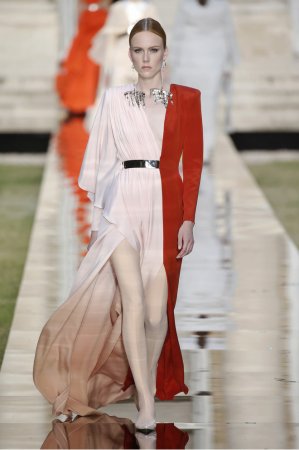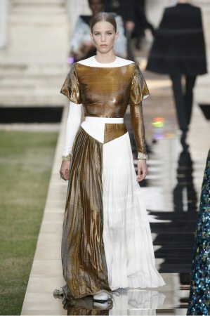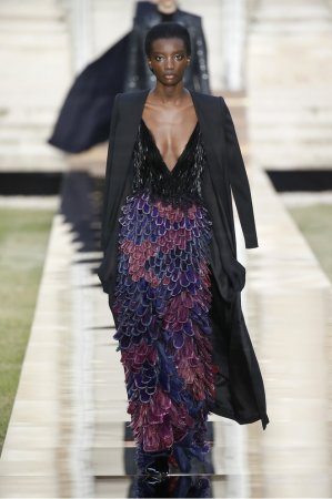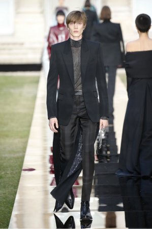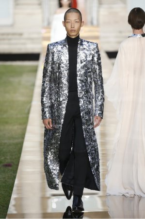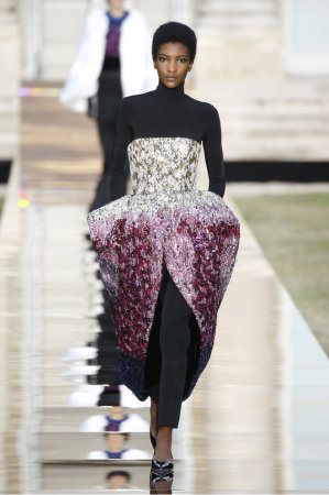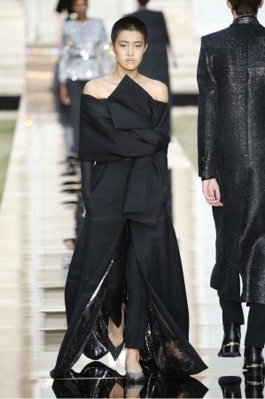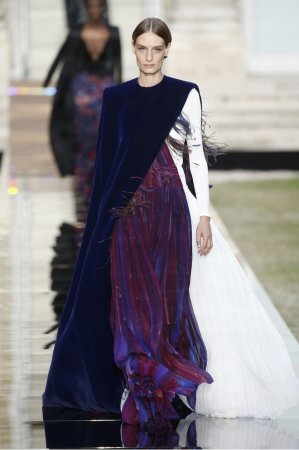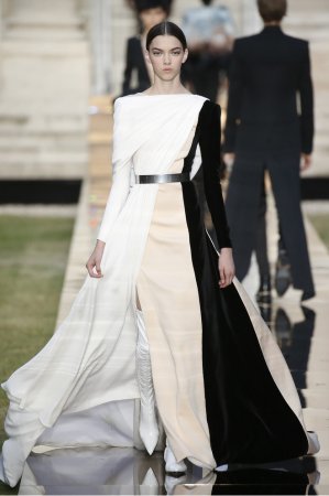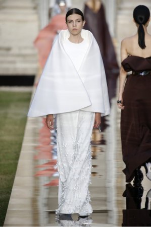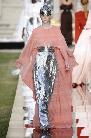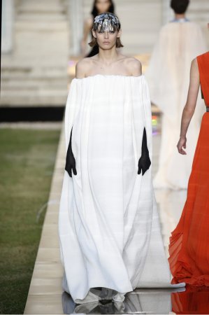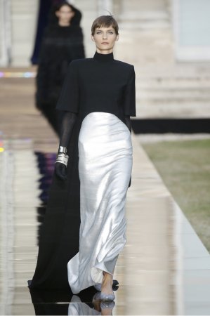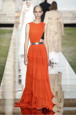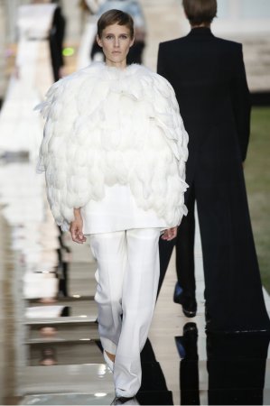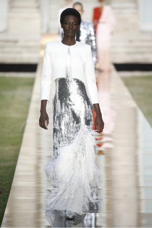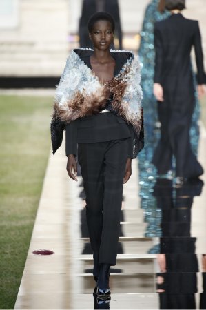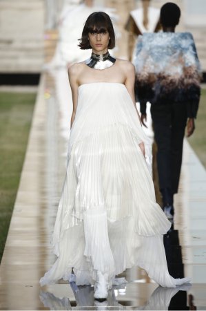 Никаких маленьких черных платьев — в коллекции из 42 образов Келлер сделала акцент на той части творчества дизайнера, которая была меньше связана с Голливудом и больше — с чистым искусством: объемные кейпы из перьев, вечерние платья с графичными вырезами, пальто, расшитые серебряными пластинами, наряды, напоминающие рыцарское облачение, в котором вместо кольчуги — тончайший плиссированный шелк и бархат. Дизайнер собрала на подиуме главные архивные хиты Живанши с поправкой на современные материалы и искусную работу мастериц ателье Givenchy, выход которых стал такой же полноценной частью шоу, как и традиционный поклон дизайнера. Под ностальгический саундтрек, разумеется, Moon River.