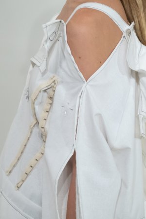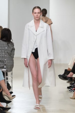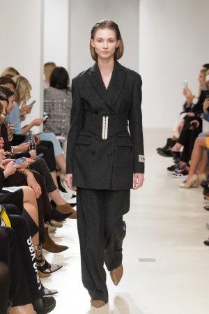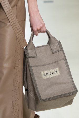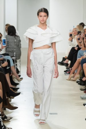 Брючные костюмы Ruban с удлиненным жакетом модели носили вместе с поясами-корсетами и изящными ботильонами, а асимметричные платья и тренчи прекрасно сочетались со слиперами и сумочками из шерсти. Главные цвета коллекции — белый, черный и бежевый.