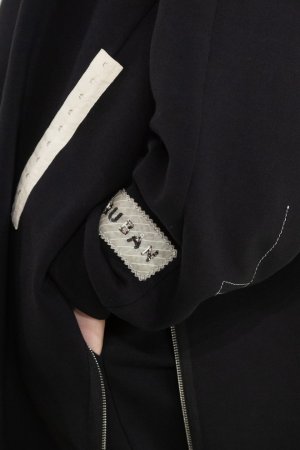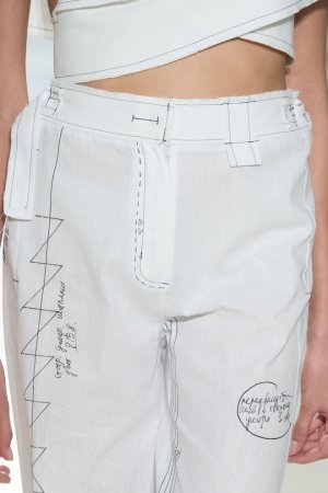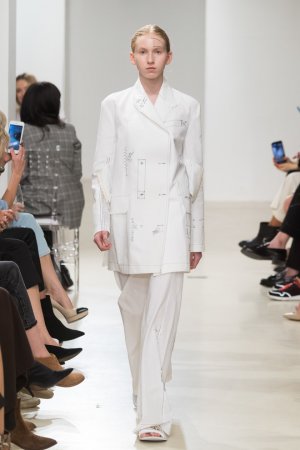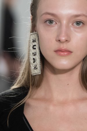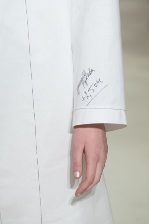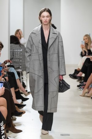 Акцентами стали тканевые серьги с вышивкой из бисера и надписи закройщиц на рукавах пальто и широких брюках.