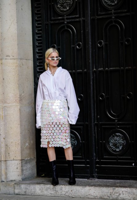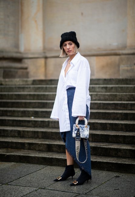 Самый легкий способ подчеркнуть талию в большой рубашке — надеть ее вместе с юбкой. Вы можете заправить в нее лишь один край или выбрать более классический вариант, как девушка на первом фото.