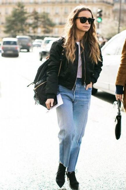 Для начала пару чисто практических стилистических характеристик. Бомбер, как любая другая куртка на резинке, создает нам объемный верх в сочетании с четко выраженной горизонтальной линией, разделяющей силуэт на две части. Это одна из практических причин, почему эти куртки менее популярны. И одна из причин, почему во всяких лукбуках мы эту модель чаще всего видим в расстегнутом виде. Потому что эта горизонтальная линия создает всегда определенные сложности. Причем, даже если в комплекте с брюками, например, куртка определенной длины вам идет, то не факт, что эта же куртка будет выглядеть хорошо, например, и с платьем.