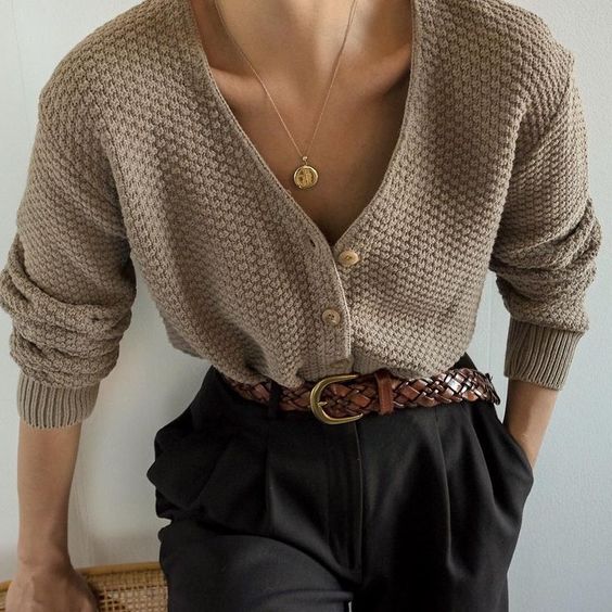 Кардиган необязательно надевать на что-то. Он вполне может быть сам по себе. И опять же, обратите внимание, — заправлен под пояс.