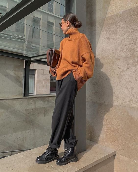 На этом фото сразу два важных момента. первый — сочетание свободного свитера с просторными брюками из мягкой фланели или подобного материала. А второй — сочетание серого оттенка с охрой (хорошо также подойдет горчичный или близкие к нему)