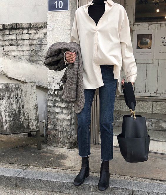 Черный свитер-водолазку носим под белую рубашку. Важно, чтобы рубашка не была слишком тонкой, а свитер — слишком объемным. Идеальным завершением такого комплекта станет жакет или пальто в клетку.
