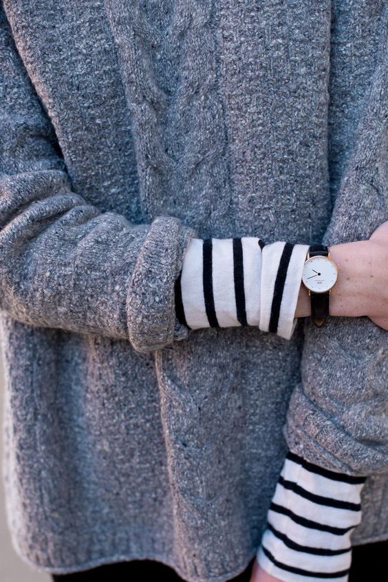 Объемный мягкий свитер из-под которого выглядывают рукава лонгслива. Простая, но эффектная деталь. Тут может быть игра оттенков или, как в варианте на фото, сочетание с принтом.
