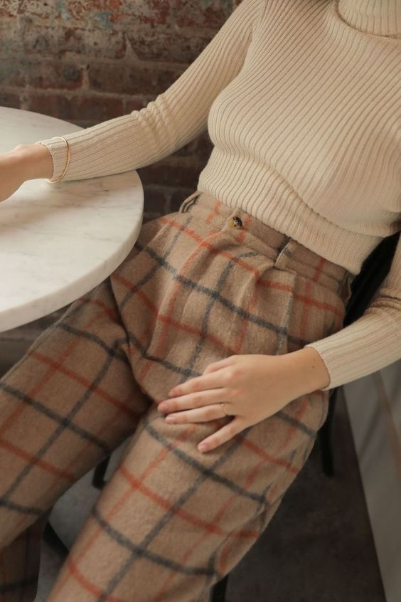 Свитера с фактурой «лапша» сочетаем с теплыми брюками из толстых тканей. Лучше всего такие комплекты смотрятся в бежевом, коричневом и близких к ним оттенках.