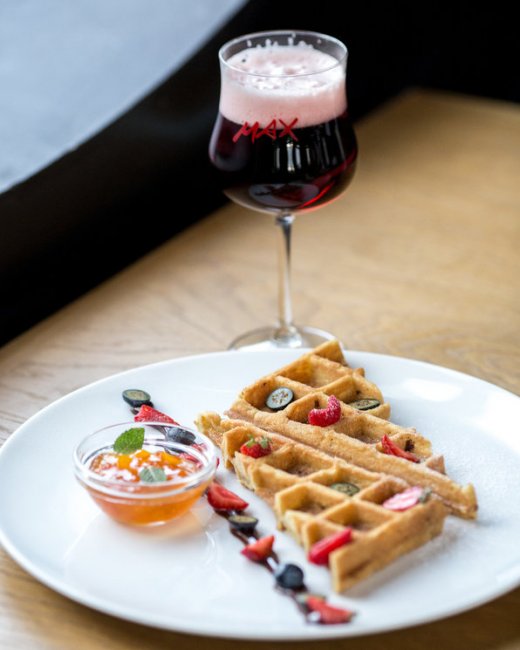Приготовить вафли. Белки отделить от желтков и взбить до состояния устойчивой пены. Смешать миксером просеянную муку, сахар, соль, желтки, пиво и мацони. Добавить подсолнечное масло (140 мл), перемешать до однородного состояния. Ввести взбитые белки, аккуратно перемешать силиконовой лопаткой. Оставить тесто «отдохнуть» на 15–20 минут. Испечь вафли в вафельнице, смазывая форму подсолнечным маслом (75 мл).