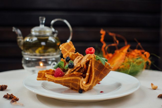 Масло растопить и немного охладить. Сахар смешать с яйцами. Муку смешать с ванилином и разрыхлителем. Соединить масло и яичную смесь, затем добавить молоко и мучную смесь. Все смешать до однородной консистенции, выпекать на хорошо разогретой вафельнице. Придать форму вазы готовой вафле можно кружкой, а можно свернуть ее трубочкой. Начинки оставим на ваше усмотрение.