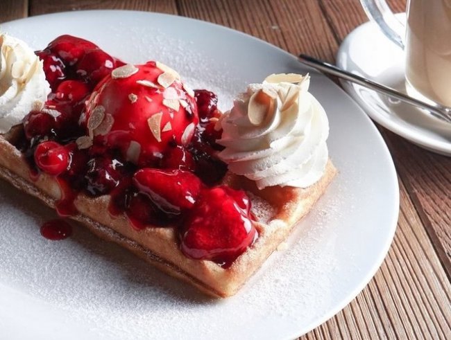 Вафли с ванильным мороженым, ягодным соусом и взбитыми сливками