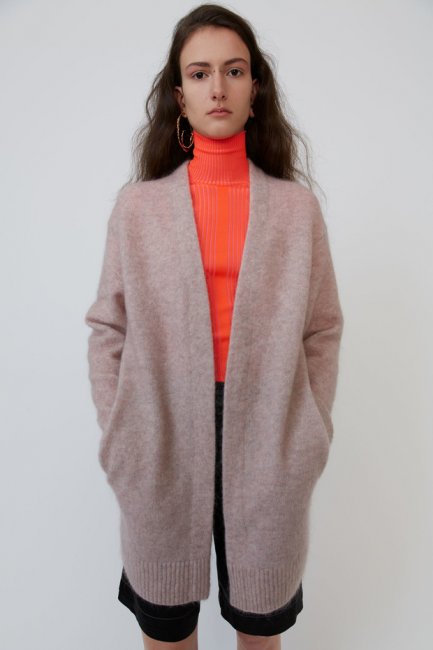 Существует риск, что длинный кардиган нейтрального цвета может выглядеть словно находка из бабушкиного сундука. Чтобы этого не допустить, стилизуйте вещь максимально смело: в лукбуке Acne Studios мы подсмотрели сочетание с неоновой водолазкой — получается крайне свежо.