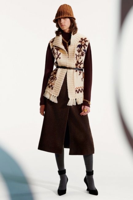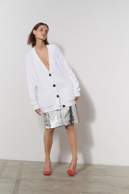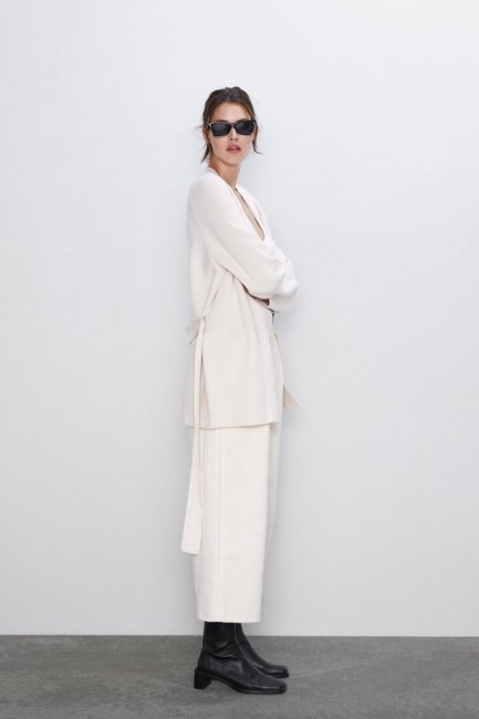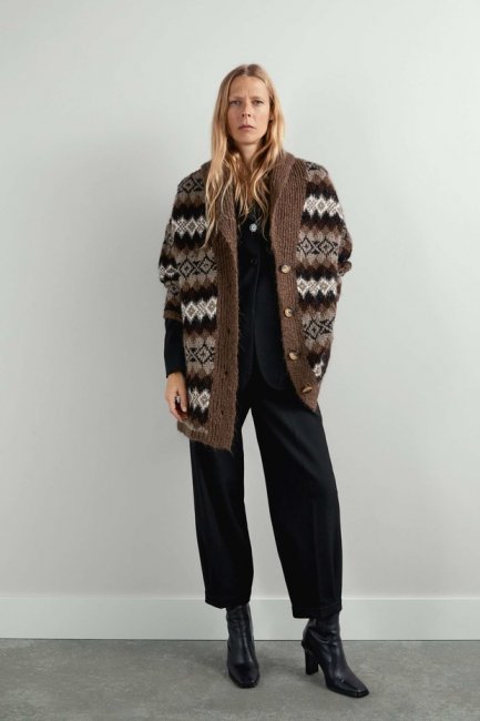 В сезонных коллекциях много кардиганов в бохо-эстетике — такие можно найти у Isabel Marant и Jacquemus, Alanui и Sacai, Missoni и Etro. Вещь с этническими мотивами будет круто смотреться на контрасте с современными силуэтами и фактурами: подойдут, например, широкие брюки. Впрочем, лично мы планируем накидывать кардиган прямо на костюм, ориентируясь на снимок из свежего каталога Zara.