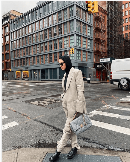Закрытая голова может стать акцентом, особенно если мы используем разницу цветов и фактур. На фото — сочетание светлого костюма из льна с черным джемпером с капюшоном. Но даже простые трикотажные худи будут работать ничуть не хуже с жакетами, кардиганами или пальто. Еще один плюс подобного сочетания — капюшон можно натягивать на голову и носить в опущенном виде. Получается два разных по выразительности и «собранности-расслабленности» образа.