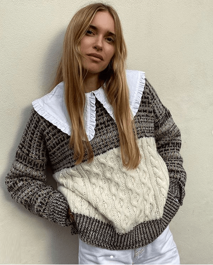 В моде романтический стиль. И один из его атрибутов — большой воротник с оборками или вышивкой. В наши сегодняшние образы быстрее впишутся не варианты, копирующие исторические образцы, а что-то, что ближе к стилю восьмидесятых. Думаю, подходящую блузку можно без особых проблем найти на секонде. Выпускаем такой воротник поверх свитера или жакета.