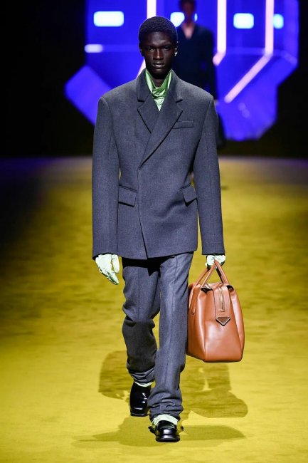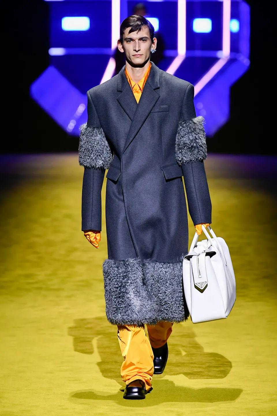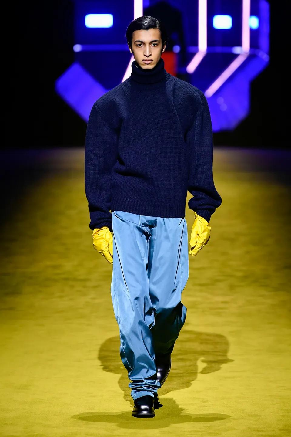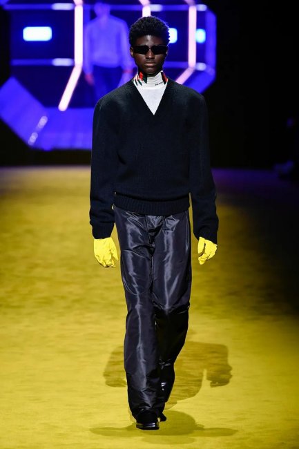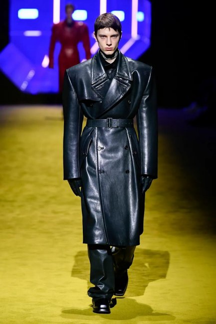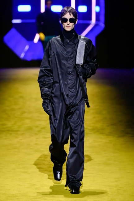 Первое, что бросается в глаза — обилие красок, текстур и слоев, свойственных коллекциям Рафа Симонса. От Миуччи в ней строгость линий, милитари-детали и эстетика аутдора. В этом симбиозе родились идеальные пальто в сочетании с нейлоновыми спортивными брюками, кожаные плащи с широкими плечами, образующие силуэт треугольника благодаря поясам, туго затянутым на талии, свободные комбинезоны, которые сочетались с водолазками и трикотажными чокерами, бомберы с меховыми манжетами и подолом, а также архивные аксессуары Prada — роботы для сумок, которые теперь стали серьгами.