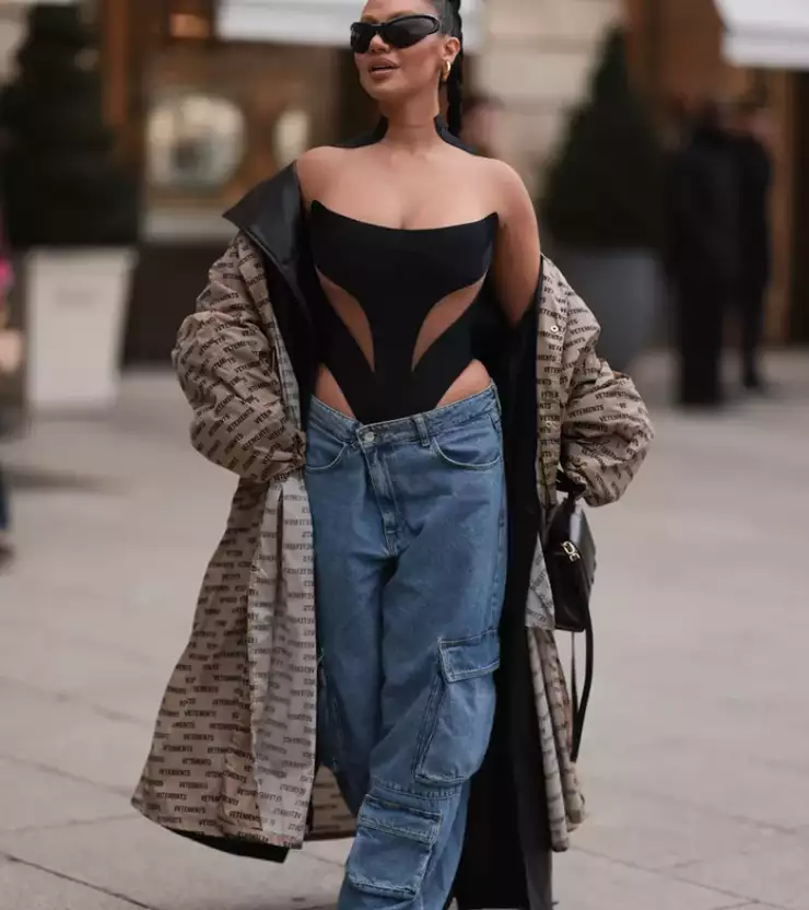 Возрождение моды Y2K в основном направлено на щедрую демонстрацию тела — но нужно соблюдать баланс. Сделайте смелый и неожиданный ход, надев боди с высоким вырезом под пару мешковатых брюк карго. «Получившийся результат будет выглядеть раскованно, чувственно и дерзко, но при этом не будет видно нижнего белья под прозрачным боди. Это беспроигрышный вариант», — говорит стилист.
