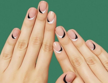 Для любительниц классических оттенков стоит обратить внимание на дизайн ногтей черно-белыми полосами возле зоны кутикулы. Выглядит очень аккуратно и оригинально.