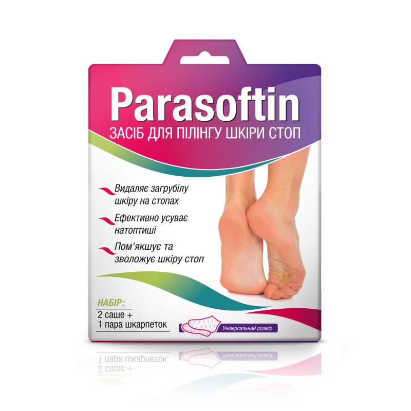 В набор «Парасофтин» входит все необходимое для комфортного использования: два саше со средством, специальные носочки и скотч-фиксатор.