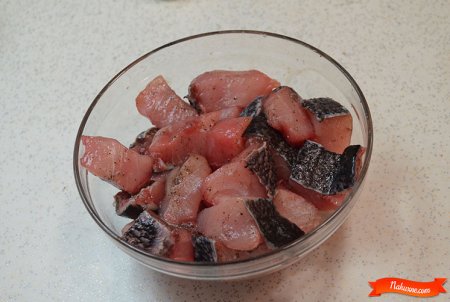 Филе Толстолоба порезать на куски 3х4 сантим.. Посолить,