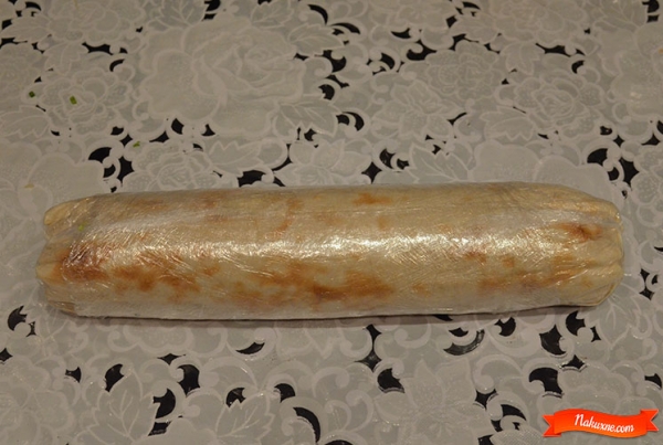 Свернуть в плотный рулет. Замотать в пищевую пленку и выслать в холодильник на 3