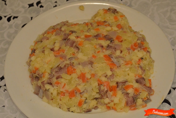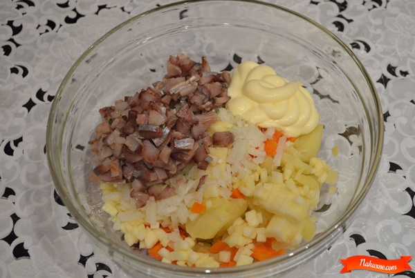 Смешать все ингредиенты с майонезом, посолить по желанию.