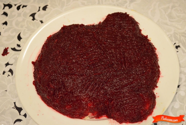 Натереть свеклу и выложить ею салат.