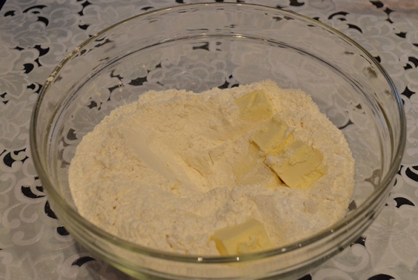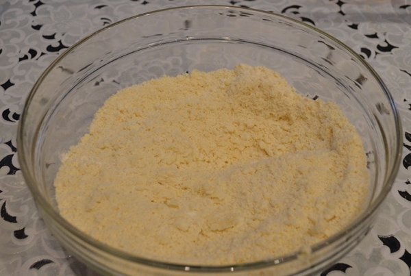 Смешать в великий миске пытку, крахмал, сладкую пудру. Добавить прохладное сливочное масло.