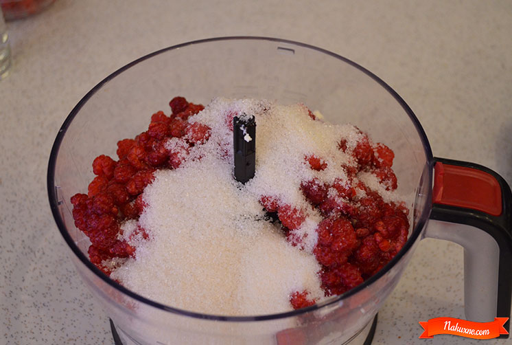 В блендере взбить сметану, творог, 300 г малины, сахар,
