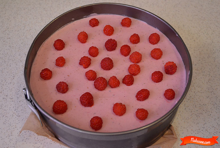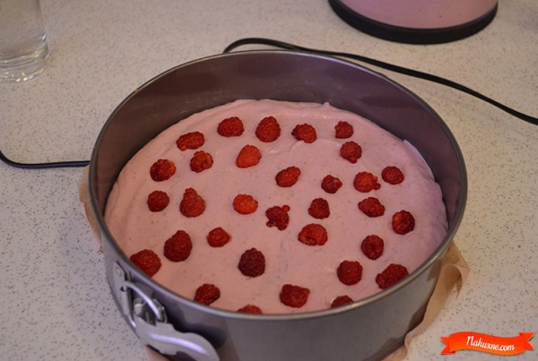 Выливаем половину творожной массы в форму. Выкладываем часть малины.