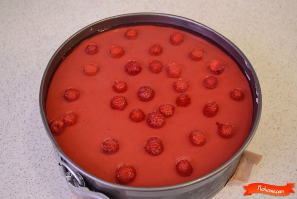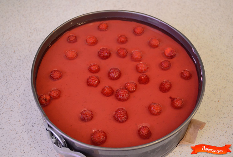 Достаем форму выкладываем набросок из ягод и заливаем тонким