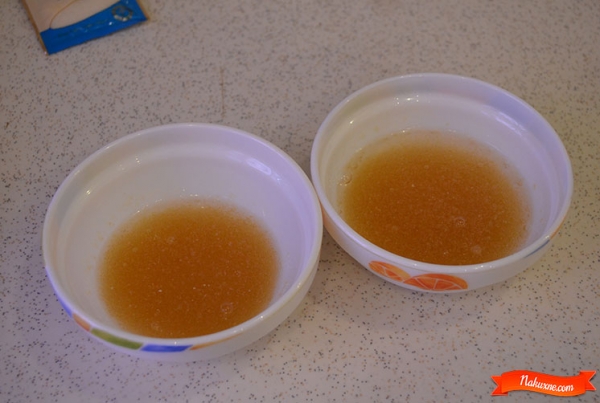 Желатин поделить, в одну емкость насыпать 20 г, а в другую