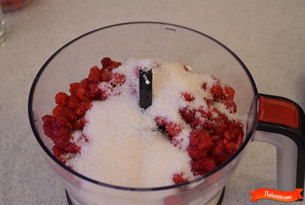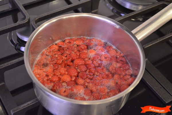 В сотейник насыпаем сто г малины 4 ч. л. сахара и 300 мл