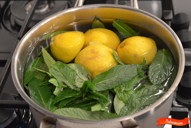 Положить в кастрюлю корки лимона, оборвать листики с мяты и