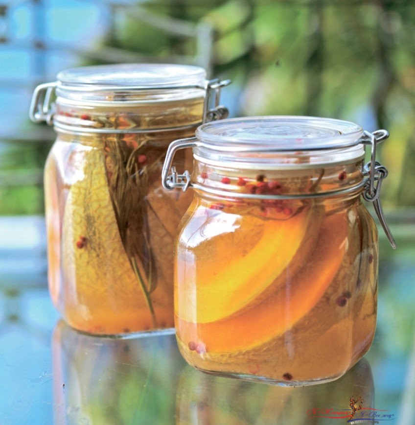 Дыня нужна спелая, но с плотной мякотью, лучше канталупа, она не развалится во время стерилизования.На 3 кг мякоти дыни:вода — 2 лсахар — 400 гбелый винный уксус 6% — 75 млрозовый перец горошком — 40 гэстрагон — 6 веточекнейодированная морская соль — 40 гПриготовление: • Дыню разрезать пополам, очистить от семечек, нарезать дольками.• Вскипятить воду, осторожно добавить дынные дольки, дать закипеть, вынуть шумовкой и переложить в миску с холодной водой со льдом. Дать подсохнуть полдня на сите, прикрыв полотенцем.• Вскипятить 2 л воды с сахаром и солью, добавить винный уксус, розовый перец, эстрагон, прогреть на слабом огне 15 минут. • Разложить дыню по банкам, добавить розовый перец и эстрагон. Залить маринадом, покрыв полностью дыню.• Стерилизовать в кастрюле с водой, для небольших банок, 0, 5 л, — 25 минут, для тех, что больше, — около часа; дать полностью остыть в этой воде, хранить в прохладном темном месте.