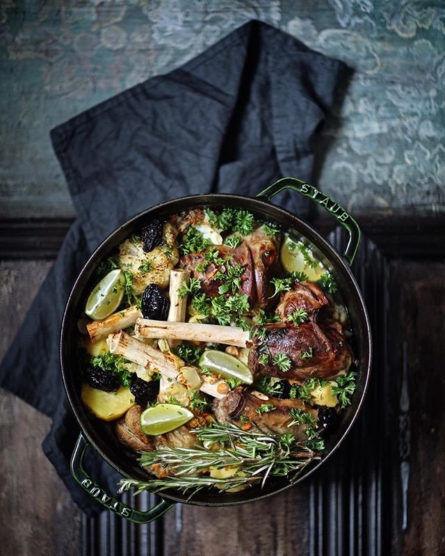 Ингредиенты: 4 бараньи голяшки3 луковицы4 моркови2 стебля сельдерея200 гр консервированного нута1 среднего размера кочан брокколи12 картофелин среднего размераИзмельченный пучок петрушкиТоматный соус 6 ст. л.2-3 лайма для подачиСольПерецОливковое маслоВода4 лавровых листа8 измельченных зачинов чеснока