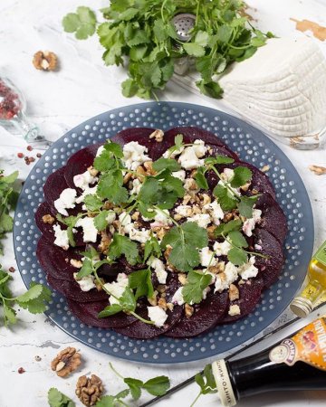 САЛАТ СО СВЕКЛОЙ, СЫРОМ И ГРЕЦКИМИ ОРЕХАМИОтварить или запечь свёклу в фольге, нарезать тонкими слайсами, посыпать адыгейским сыром, грецкими орехами, кинзой и полить гранатовым соусом и оливковым маслом, соль/перец добавить по вкусу.