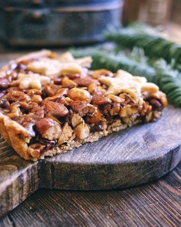 instagram.com/inn5775/ Ингредиенты (на форму 22 см): Для теста: 90 гр пшеничной муки80 гр ржаной муки1 ст. л. сахара1/4 ч. л. соли150 гр охлаждённого сливочного масла3-4 ст. л. ледяной воды Начинка: 380 гр смеси орехов (фундук, миндаль, грецкий)80 гр сливочного масла70 гр коричневого сахара 90 гр мёда2 ст. л. ложки сливок 33% жирности1/4 ч. л. соли instagram.com/inn5775/ Процесс приготовления:1. Приготовить тесто. Смешать оба вида муки, сахар и соль. Добавить масло и перетереть в крошку. Влить воду и быстро замесить тесто. Убрать в холодильник минимум на 1 час.2. На присыпанном мукой столе раскатать тесто толщиной 3 мм, перенести в форму, подрезать края и убрать в морозилку. Из остатков теста вырезать звездочки и также убрать в морозилку. 3. Тем временем приготовить начинку. Орехи подсушить в духовке при 160 градусах 15 минут, остудить и крупно порубить. Смешать в кастрюле масло, сахар, мёд, сливки и соль. Помешивая, довести до кипения, добавить орехи и снять с огня. Остудить до тёплого. 4. Выложить начинку на замороженную заготовку. Украсить звёздочками. Выпекать при 175 градусах 25-30 минут, пока начинка не начнёт пузыриться. Вынуть из духовки, дать полностью остыть. instagram.com/inn5775/