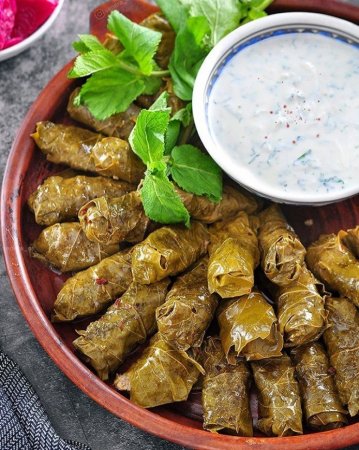 Ингредиенты:листья виноградные (свежие или маринованные) — 300 грмякоть говядины — 1 кгбараний курдюк — 200 грлук (в фарш) — 2 штрис круглозёрный — 80 гркинза — 50 грмята свежая — 30 грвода (для фарша) — 200 млсоль — по вкусучёрный перец молотый — по вкусузира — пара щепоток?Йогуртовый соус:йогурт (или мацони) — 200 грчеснок — 2 зубчикакинза — 5 веточекмята (листья) — 3 веточкисоль — по вкусу.