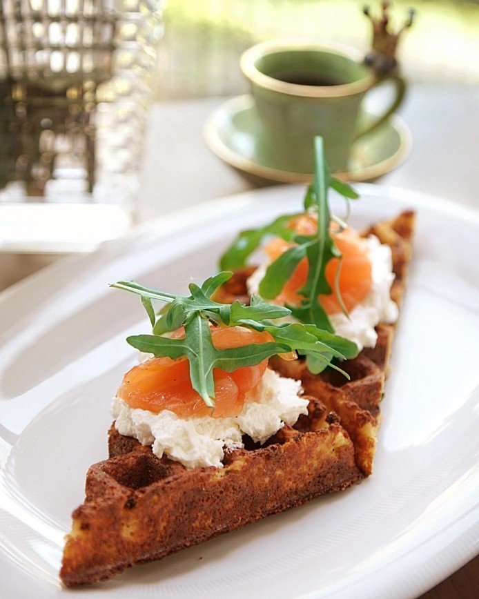 Процесс приготовления:1. Смешиваем кефир, яйца, сыр чеддер. 2. Добавляем сливочное масло, шпинат, миндальную муку. 3. Все тщательно перемешиваем миксером. Получаем основу для вафель. 4. Выпекаем вафли! 5. Смешиваем творожный сыр со сметаной. 6. Подаем готовые вафли с творожным сыром+ сметаной, шпинатом и лососем.