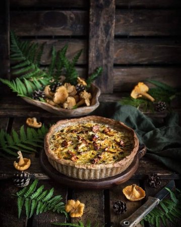 Ингредиенты:Тесто:Картофель (отварной) 280 гр Масло сливочное 80 гр (комнатной температуры)Мука пшеничная цельнозерновая 180 гр Соль щепоткаХолодная вода 1 ст. л. Начинка:Лесные грибы (белые и лисички) 300 гр Сливочное или растительное масло 1 ст. л.Лук порей 10 см Яйца 3 штСметана 160 гр (33%), можно заменить сливками Щепотка соли и тимьяна