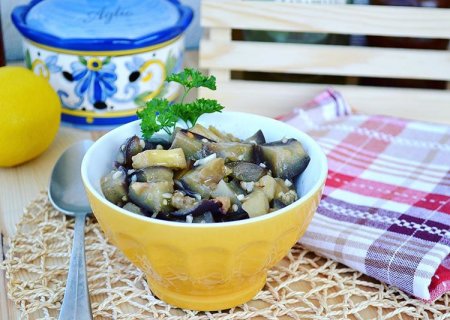 Процесс приготовления:1. Баклажаны вымыть и нарезать кубиками среднего размера. В глубокой сковороде разогреть растительное масло, выложить баклажаны и добавить пару ложек кипятка. Накрыть сковороду крышкой и тушить баклажаны на среднем огне минут 5. Затем снять крышку и тушить еще пару минут, до испарения лишней жидкости.2. Пока тушатся баклажаны приготовить маринад. Для этого очистить и порубить зубчики чеснока (не используйте пресс для чеснока, так как его кусочки должны чувствоваться в маринаде). Смешать в небольшой миске свежевыжатый сок лимона, мед, рубленный чеснок, сок и чили перец.3. Как только вся жидкость из баклажанов выпариться, добавить в сковороду подготовленный маринад и перемешать. Снять с огня и накрыть крышкой. Дать остыть и настояться. Вкуснее всего такая закуска будет в охлажденном виде.