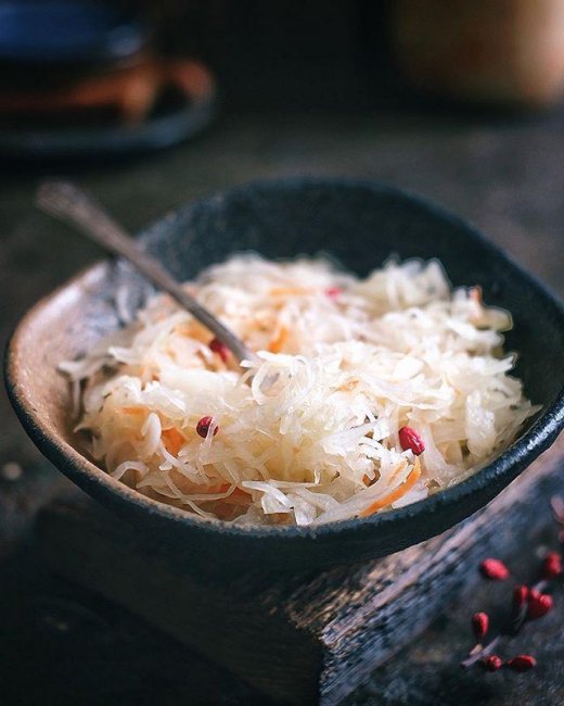 Процесс приготовления:1. Капусту шинкуем, одну небольшую морковь натираем на крупной терке. Перемешиваем в большой емкости. Набиваем в трехлитровую банку, без особого фанатизма, но туго. 2. В 1 литре холодной воды развести соль и залить в банку. Покажется, что рассола мало, но так и должно быть, капуста даст сок. Прикрыть марлей и оставить на 2-3 дня, в зависимости от температуры на вашей кухне. 3. За это время 2-3 раза в день нужно протыкать капусту деревянной палочкой для выхода газов. По истечении 2-3 дней слейте рассол, добавьте к нему сахар, размешайте до растворения и снова залейте в банку. Уберите банку в холодильник.