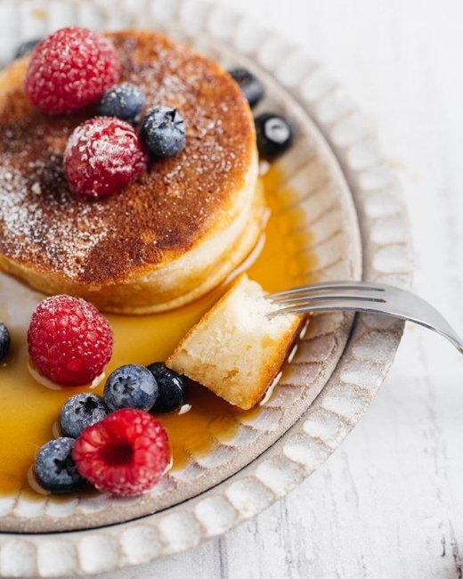Процесс приготовления:1. В среднюю миску добавьте яичный желток, молоко, растительное масло и ваниль. Перемешайте венчиком. ?2. В другую миску добавьте сухие ингредиенты — муку, сахарную пудру, разрыхлитель и соль. Перемешайте до объединения. ?3. Теперь добавьте жидкие ингредиенты в мучную смесь. Перемешайте венчиком до однородной массы. ?4. Белки взбейте в миксере до крепких устойчивых пиков.?5. Аккуратно введите взбитые белки в тесто. С помощью лопатки вмешайте их равномерно. Тесто должно быть воздушным. Старайтесь не вымешивать долго, иначе белки осядут. ?6. Нагрейте сковороду и смажьте ее растительным маслом. Огонь должен быть ниже среднего.?7. Заполните круглую форму (размером 8 см) на 2/3 и накройте крышкой сковороду. ?8. Готовьте панкейки 4-5 минут (время зависит от размера), пока дно не станет золотисто-коричневым, а стороны не застынут. ?9. С помощью силиконовой лопатки переверните панкейк и обжарьте со второй стороны до готовности.?Совет. Если нет круглой формы, выложите тесто ложкой для мороженого или любой другой. Это будут такие же вкусные панкейки, только не такие высокие.?