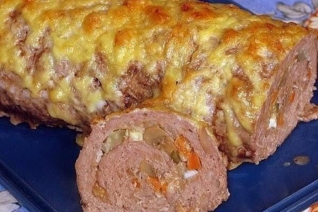 Сверху всё посыпать тёртым сыром. Осторожно свернуть в рулет.