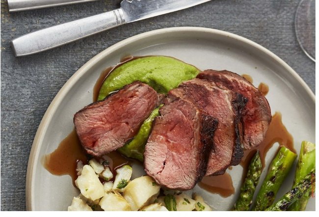 Разложите горошек в подогретые тарелки. Баранину нарежьте толстыми ломтиками и выложите поверх горошка. Присыпьте орегано, сбрызните ароматным оливковым маслом первого отжима, приправьте морской солью и крупно молотым черным перцем. Подавайте с молодым картофелем или спаржей.